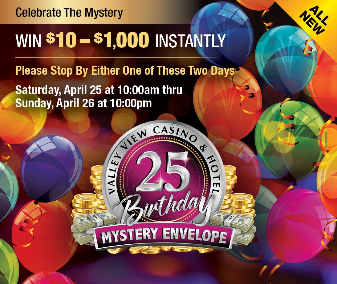 Players Club25th Birthday Mystery Envelope Are you ready to discover your prize? Invited guests will bring in their unopened Mystery Envelope on April 25 or April 26 to reveal a prize of $10 – $1,000. To learn more about or Mystery Envelope promotion and to find out how you can participate, please visit our Players Club.